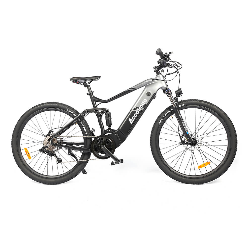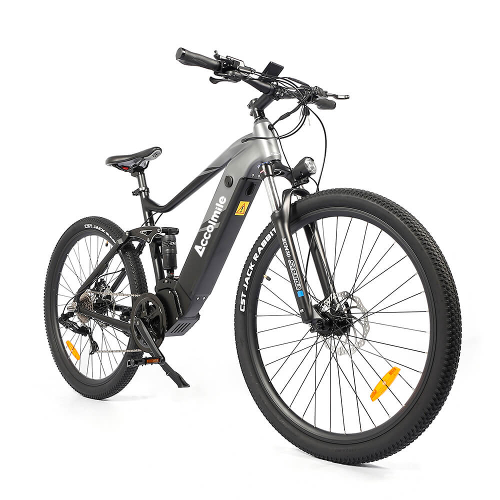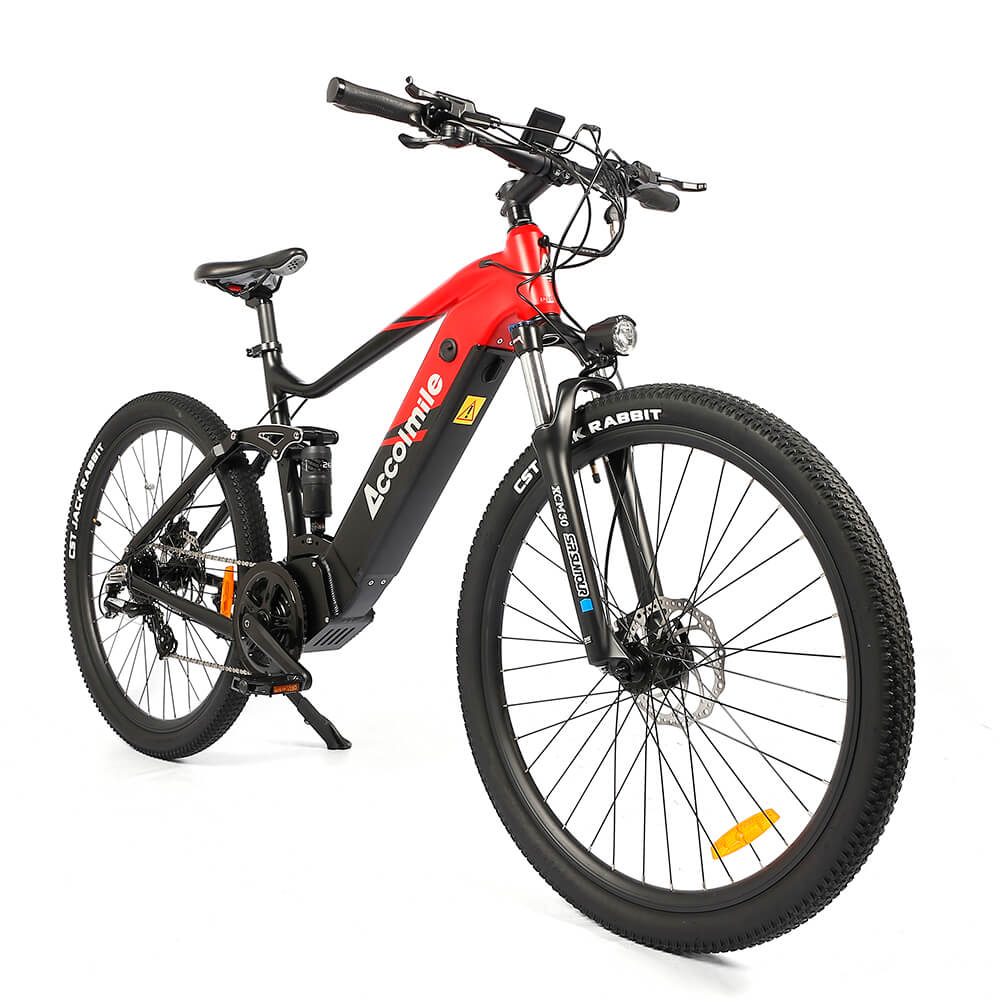 Accolmile Cola Bear electric mountain bike absorbs the advantages of many mountain bikes, suspension fork, large knobby tires, more durable wheels, more powerful brakes, straight, extra wide handlebars to improve balance and comfort over rough terrain.