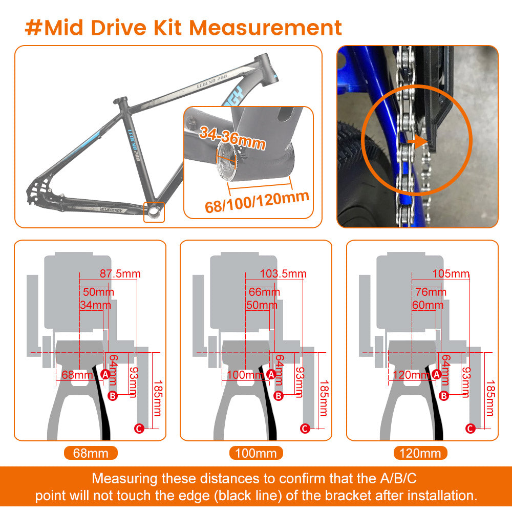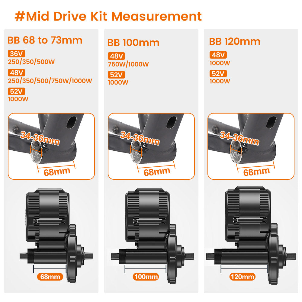 Electro City Bikes provides 68 to 73mm/100mm/120mm BB size for BBS series (250W/350W/500W/750W/1000W) mid drive kits. 68 to 73mm BAFANG mid drive kits are suitable for most bicycles, if you still don't know whether our motor is suitable for your bicycle, you can download and print our measuring paper for measurement, or you can contact us direct to confirm the size.